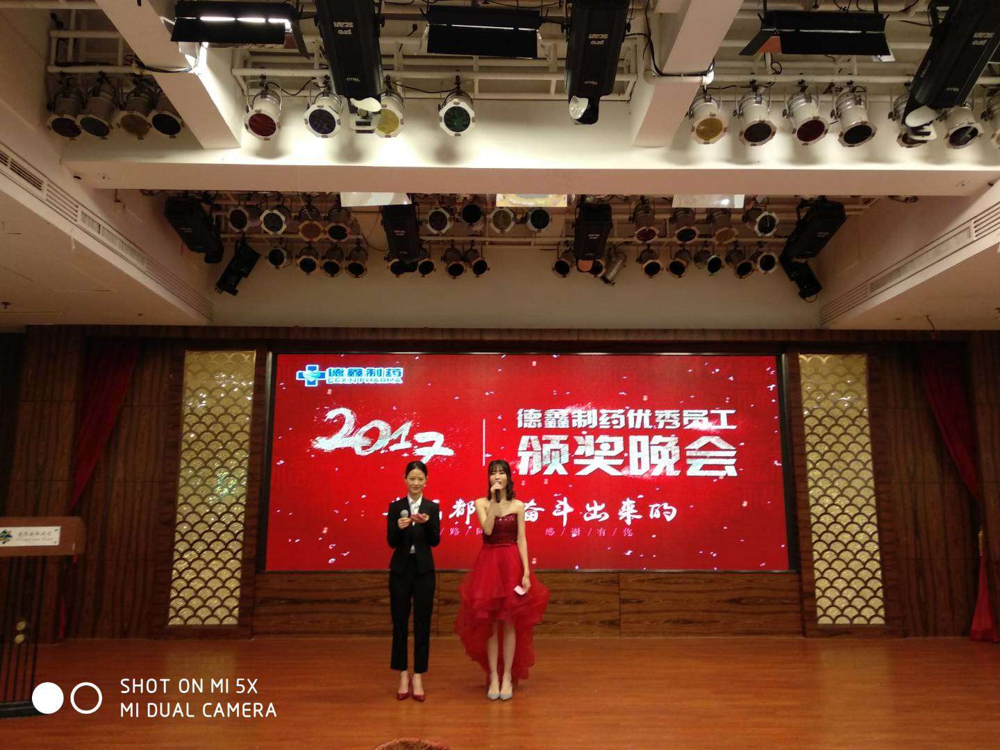 您们好! 感谢你们一直以来对广东德鑫制药有限公司的信任、关怀和支持! 仰首是春、俯首成秋,借此新年之际,为感谢广大员工辛勤工作,我公司在2018年1月30日举行了年终晚宴暨优秀员工颁奖晚会,行政、质量、生产、工程中心、营销中心、财务等部门均精心准备并呈现了精彩的节目表演,还有激动人心的抽奖环节,让大家尽情玩乐。 新的一年,我们共同努力,一起用行动去证明:幸福是奋斗出来的!